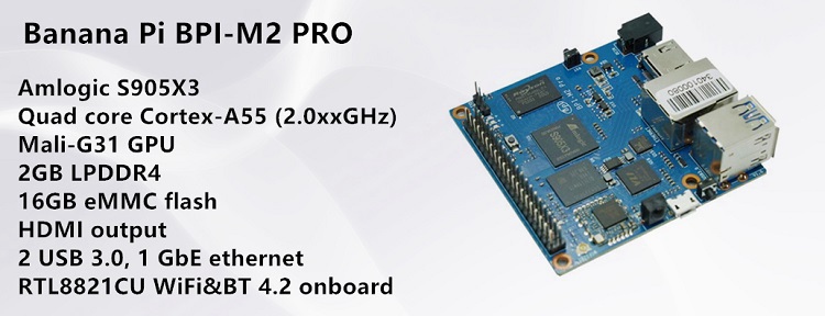 Banana Pi BPI-M2 Pro是Banana Pi公司于2021年推出的下一代单板机。它采用Amlogic S905X3四核Cortex-A55 (2.0 XXGHz)处理器。板载2GB LPDDR4内存和16GB EMMC存储,支持2个USB 3.0接口,1个千兆网口。板载RT8821CU wifi&BT。1 HDMI输出 905X3是晶晨半导体旗下最新的8K智能家庭影音芯片,采用四颗64位ARM A55架构 CPU芯片,集成G31图形处理器,支持8K视频解码和8K视频输出,运行开放的安卓9.0系统和Linux系统。
