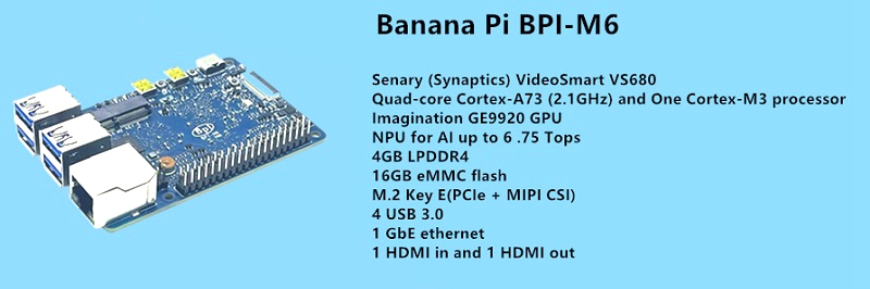 香蕉派BPI-M6是香蕉派社区在2022年推出的新一代单板计算机,它采用深蕾半导体(Synaptics) VS680四核Cortex-A73 (2.1GHz)和一个Cortex-M3处理器,Imagination GE9920 GPU。 NPU高达6 .75 tops算力。 板载4GB LPDDR4内存和16GB EMMC存储,支持4个USB 3.0接口,1个千兆网口。 板载1个HDMI-rx端口和1个Hdmi-tx端口。