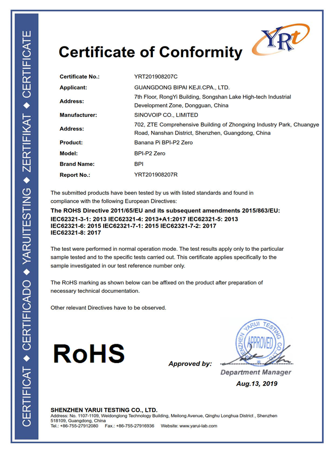 • 香蕉派 BPI-P2 Zero RoHS 证书