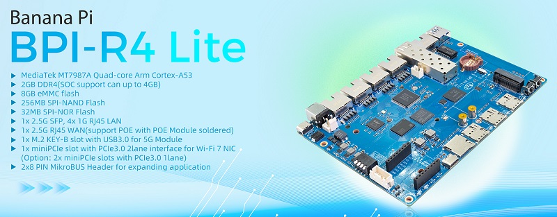 Banana Pi BPI-R4 Lite smart router board design with MediaTek MT7987A Quad-core Arm Cortex-A53,it support 2GB DDR4 and 8G eMMC Flash on board. 1 2.5G SFP and 1 2.5G RJ45 WAN , support 4 x 1G RJ45 LAN port. support M.2 for 4G/5G module.1x miniPCIe slot with PCIe3.0 2lane interface for Wi-Fi 7 NIC.