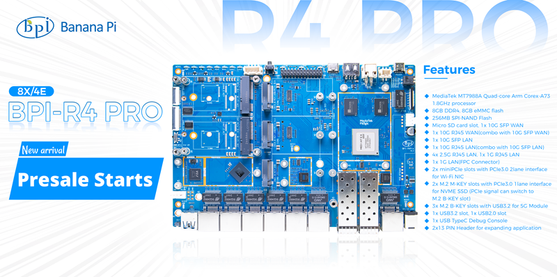 The Banana Pi open-source community series of router development boards have sparked a craze in the open-source community since their release. Particularly, the BPI-R4, the router with the strongest configuration in history, has been selling well for nearly three years and has received full support from the Openwrt open-source community. Based on this, and in response to various suggestions from community developers, the BPI-R4 Pro was born. The Banana Pi BPI-R4 Pro router board is designed with a MediaTek MT7988A (Filogic 880) quad-core ARM Cortex-A73, featuring 8GB DDR4 RAM, 8GB eMMC, and 128MB SPI-NAND flash memory. It supports four 2.5G Ethernet ports, two 10G optical-electrical ports, and 4G/5G expansion. It also provides a rich array of peripheral interfaces, allowing users to develop a wide range of network applications on it.